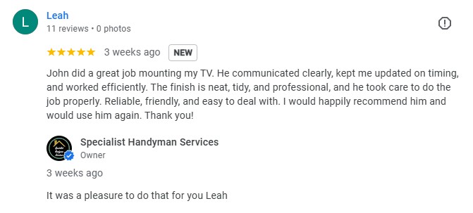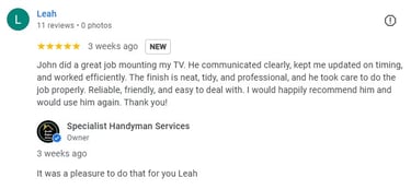 Excellent service for a very tricky job, we had a large very heavy mirror fitted in a very awkward place. I’m so pleased we found him, as would not have been able to do it ourselves